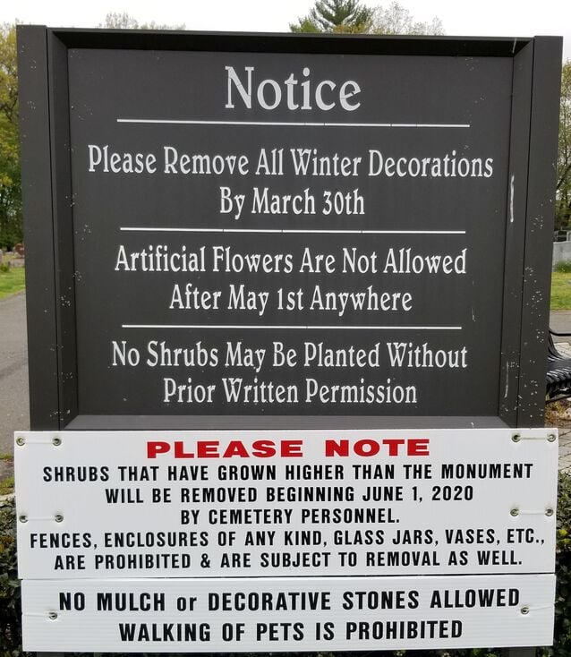 7. The right is reserved by the Cemetery to remove any trees, shrubs, plants, monuments, grave markers, inscriptions or any other objects deemed objectionable or injurious. In particular, shrubs that have grown higher than the monument are subject to removal. Such removal can be made without notice.